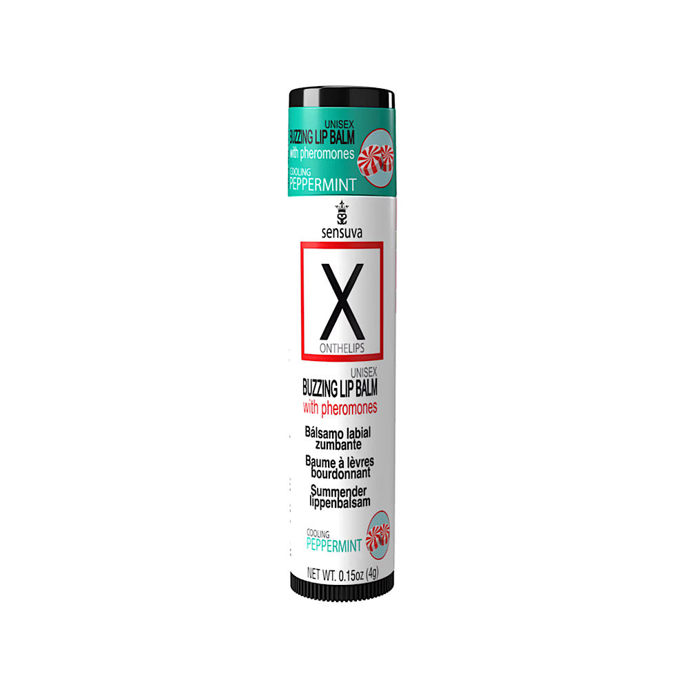 Peppermint X On The Lips Buzzing Lip Balm with Pheremones - a unique, buzzing lip balm infused with gender friendly pheromones. It turns your lips into a vibrator and transfers a tingly kiss to your partner's wherever! Naturally moisturizing, lightly flavored. (4g / .15 fl. oz )