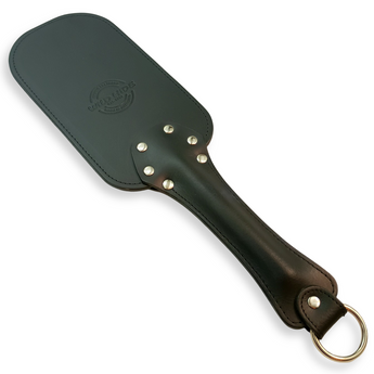The Dom Paddle: Solid Leather Authority. Crafted from robust belting leather, this paddle is built to last. Featuring a stitched striking surface for enhanced impact and a full leather handle with a convenient chrome O-ring for hanging. This paddle delivers heavy-duty performance from its premium materials to its durable construction and will command attention in any Dungeon space.