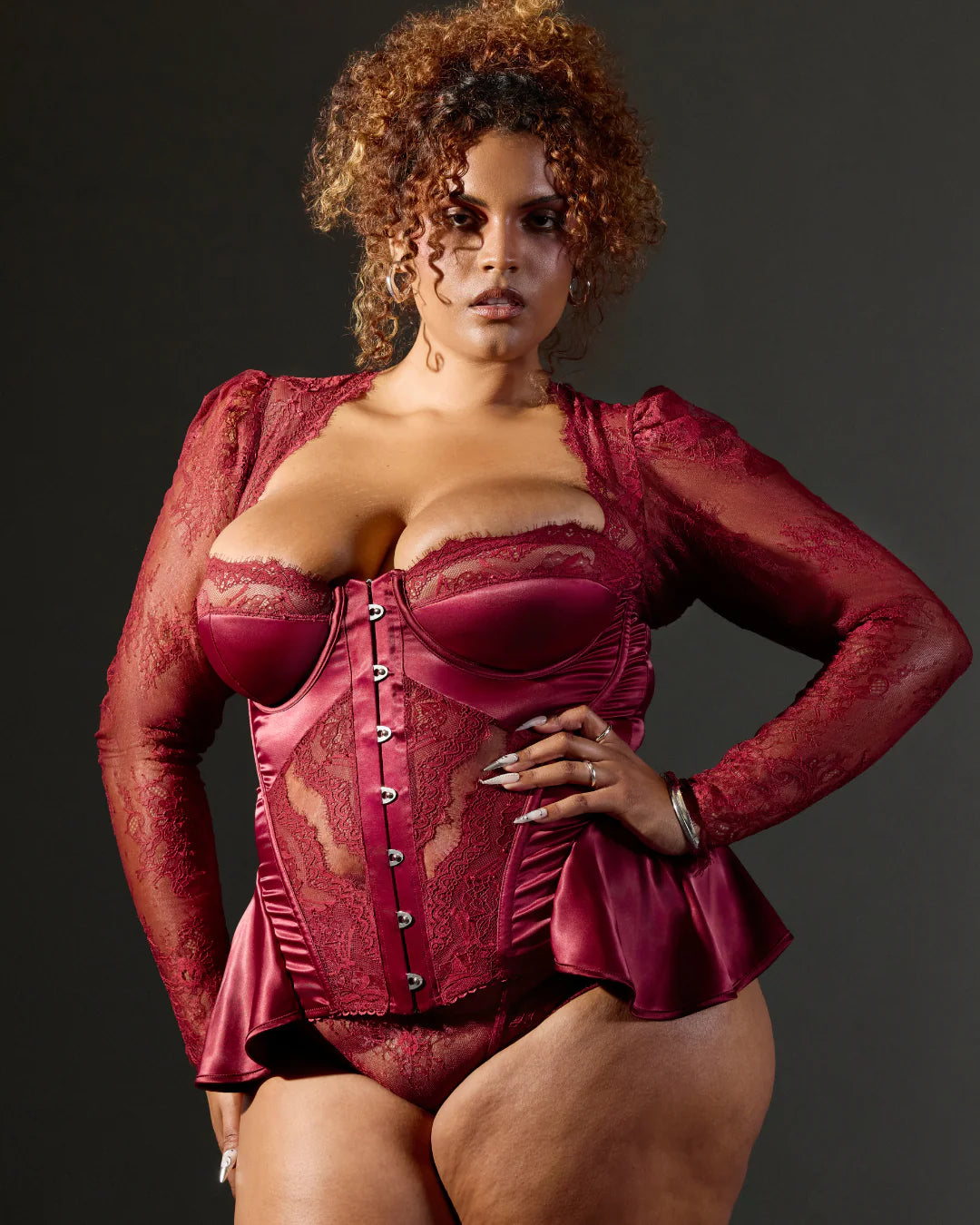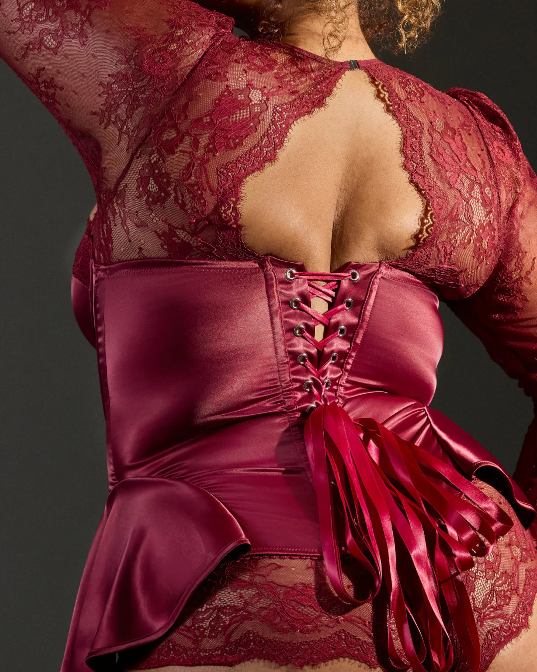 Luxurious satin and lace Corset with center front busk, sheer lace appliqué, seductive side flutters at hip, lace up back, and long lace sleeves.