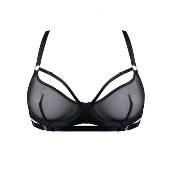 A sheer mesh underwired balconette bra finished with adjustable bust straps. An elastic panelling centre front detail, fully adjustable back straps and a 24k gold plated zip fastening ensure a feature is made of every angle.