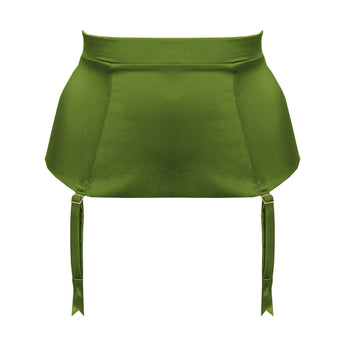 Crafted from panels of jungle green, cruelty-free silk satin, the Petra Longline Suspender forms elegantly to your body, hugging every curve for a smooth silhouette. Adjustable silk-wrapped waist straps help create the perfect fit and feature 24k gold plated hardware and clasp fastening. Each suspender strap is finished with a fishtail-cut ribbon in satin, for an added feminine touch.