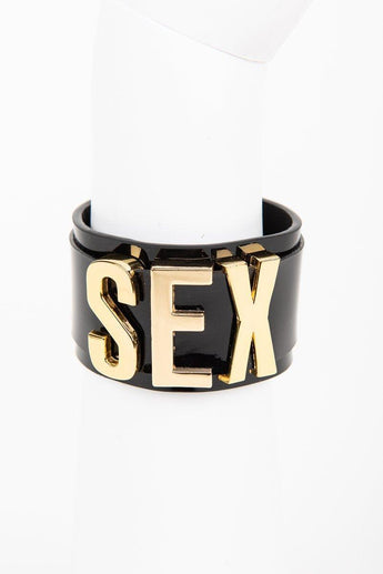 Fräulein Kink's SEX Cuff is handcrafted using Italian black patent leather and accented with gold trims. This is one fabulous wrist accessory.