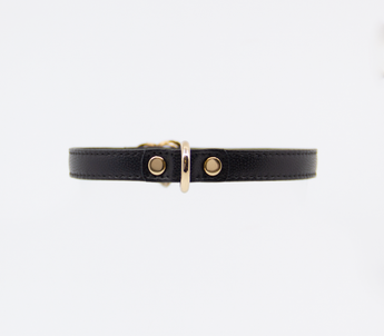 Unlined, dainty leather collar with gold tone hardware & heart shaped buckle. Collar features a centre D to attach your choice of shackle or lead.