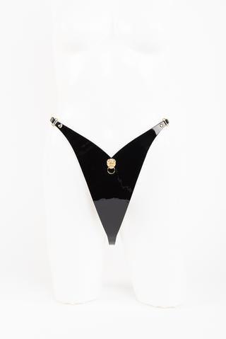 The high cut Leone String is handcrafted from black Italian patent leather and finished with Gold Lion head and brass riveting. The string also features adjustable double faced satin elastic sides for easy size adjustments.
