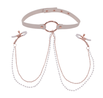 Spice up your playtime with the Peaches ‘n CreaMe Collar with Nipple Clamps and experience extraordinary pleasure! This playful accessory blends luxury with a touch of naughtiness, featuring a delightful peach-colored collar adorned with rose gold hardware and tantalizing attached nipple clamps!
