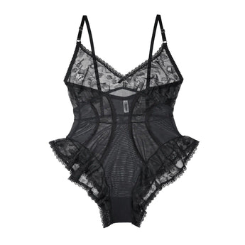 The most romantic bodysuit, crafted from soft and stretchy lace and mesh. Designed with bold lines that contrast against delicate flounces, creating a balance of structure and softness. Adjustable straps ensure a flexible fit, while the full-coverage brief offers comfort without compromise. Finished with a dagger charm at the centre front for a small but sharp touch.
