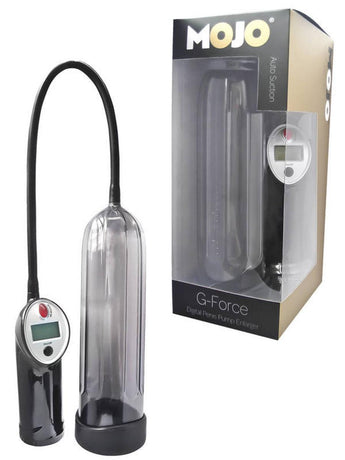 The G-Force Pump is a step up from the Mojo Penis Pump. Instead of squeezing the pump with your hand, you simply press a button and the battery operated pressure guage does the work for you.