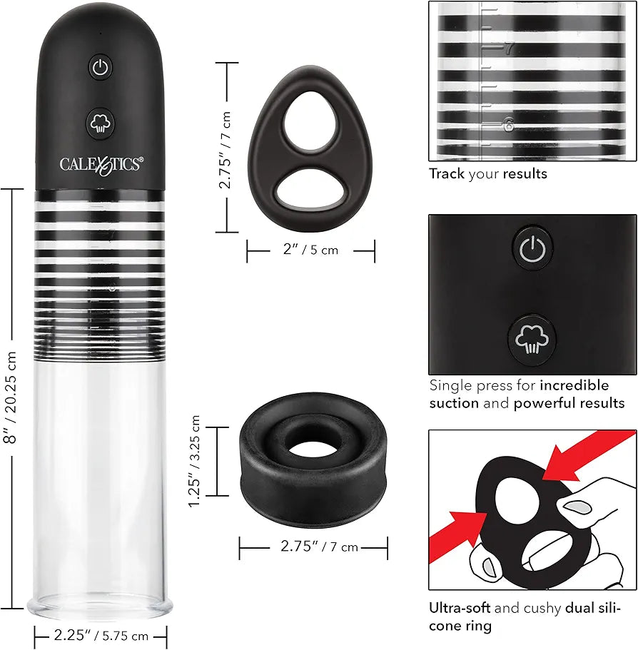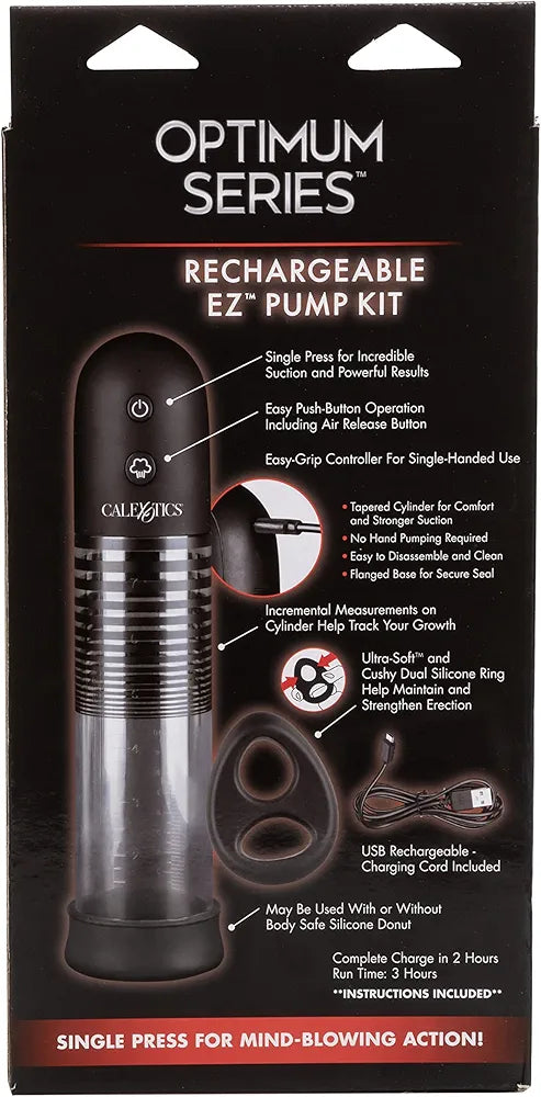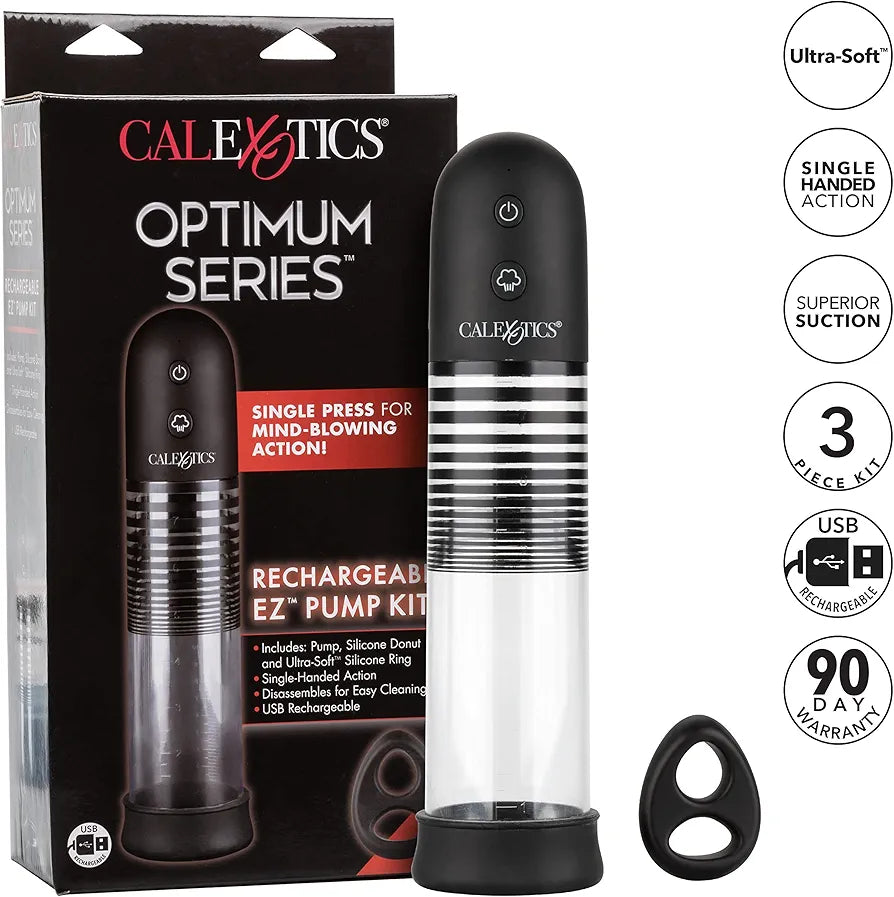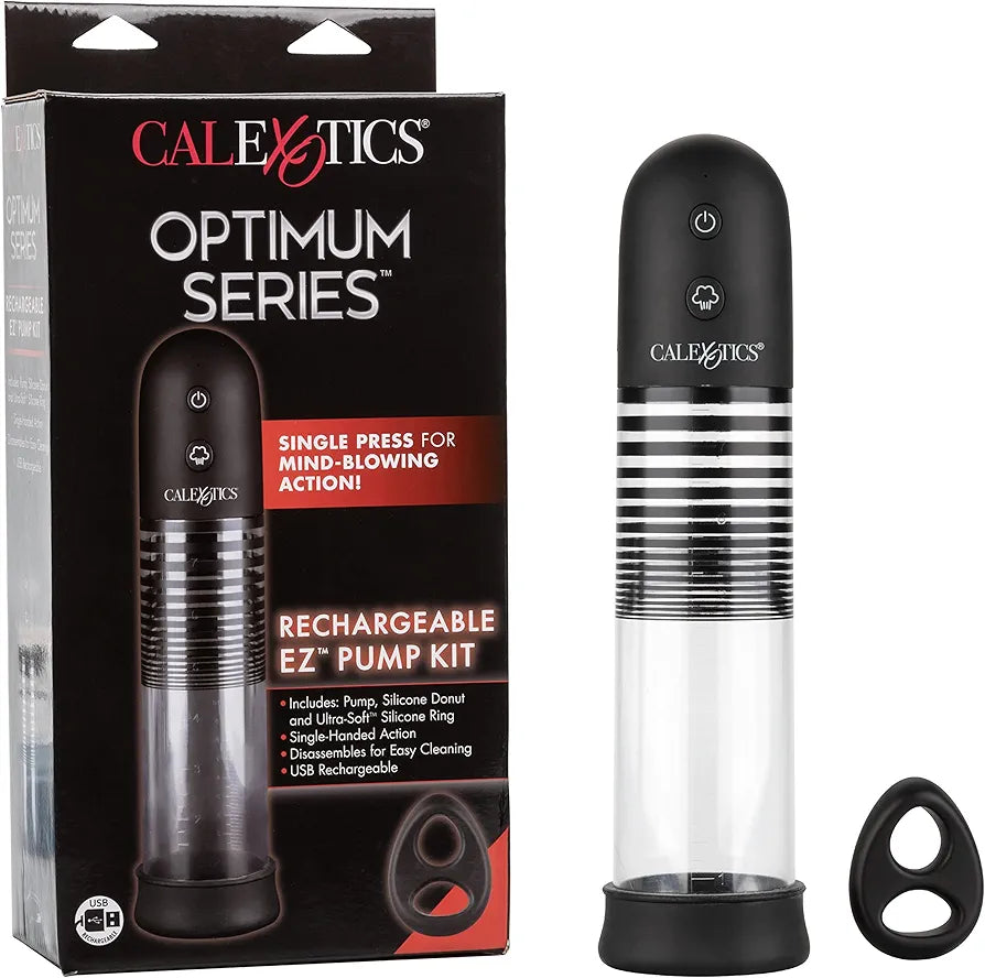 Discover the Optimum Series Rechargeable EZ Pump Kit — designed for those looking to enhance confidence, support erectile health, or explore new sensations with ease. This automatic, rechargeable pump offers powerful, consistent suction at the touch of a button. The ultra-flanged base creates a secure seal, while the soft silicone donut provides comfort and stability during use.