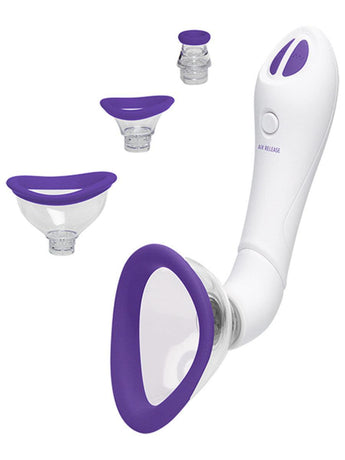This automatic suction cup and vibrator has 4 different-sized, interchangeable heads with soft, silicone rims made for stimulating the user's clitoris, vulva, and nipples. The cups are designed to follow the natural curve of a woman's body, and the handle is ergonomically designed for comfortable use. 7 vibration patterns and 7 suction functions allow for 49 unique sensations, which operate with just the touch of a button and can be enjoyed hands-free once the optimal seal is formed.