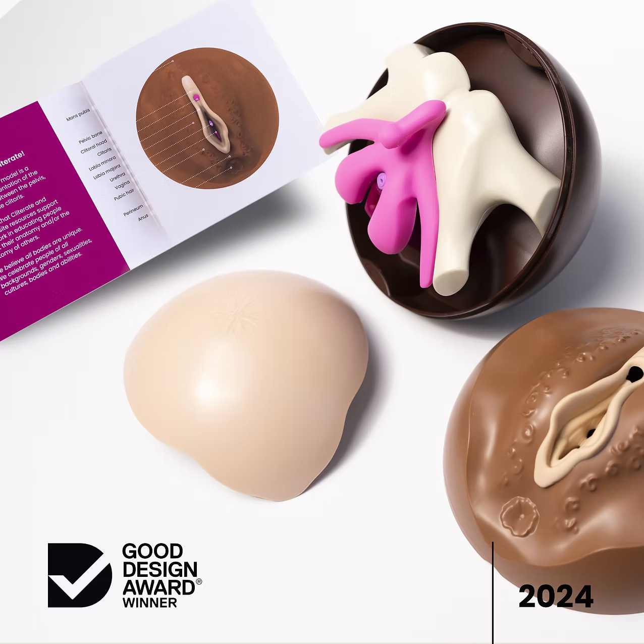 Cliterate's spherical, pull-apart design accurately explains the relationship between the clitoris, vulva and pelvis. It was created to support educational resources and to encourage respectful conversations between health practitioners, educators, clients and students.
