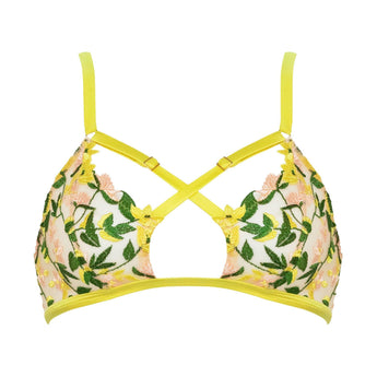 The Liana combines the comfort of a bralette with playful harness strap detailing, making for a bold everyday look. The delicate cups are crafted from embroidered tulle, enveloping your body in a vibrant vines and florals. The bespoke embroidery is complemented by a chartreuse, cruelty-free silk satin trim and a gold plated hardware detail for added luxe.
