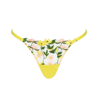 The Liana Strap Thong brings together striking gold plated hardware and ornately embroidered tulle, adorning your body with vibrant vines and florals, revealing glimpses of skin below. Our signature chartreuse peace silk complements the bespoke embroidery for a luxe finish.