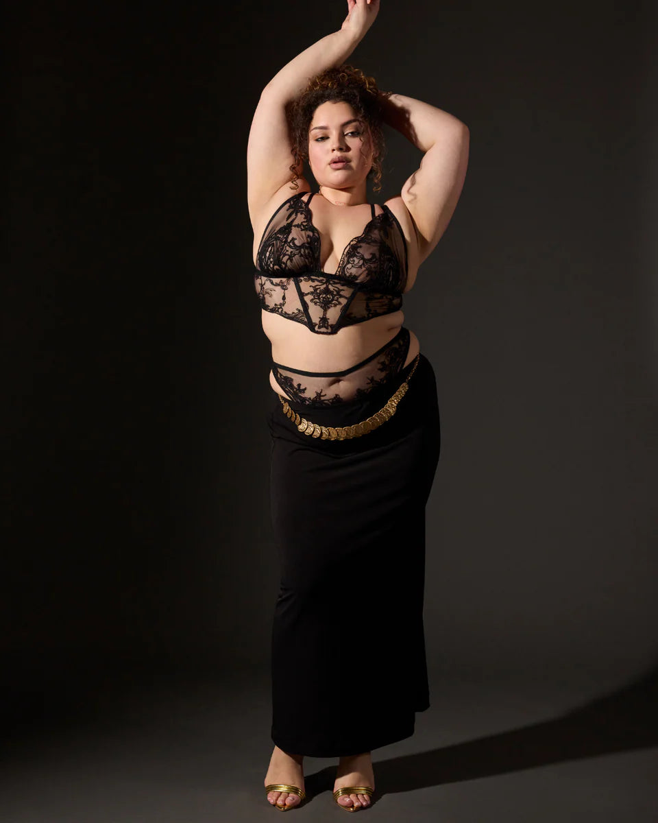 Custom T&S embroidered tulle and stretch mesh Thong with V waistband and strappy leg elastic details. Pair with the Magdalene Bralette.