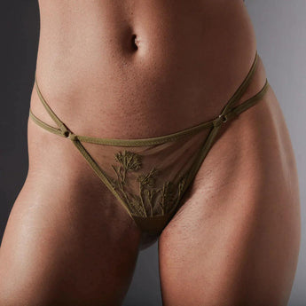 The Mullberry thong is a double threat with strappy sides and floral embroidery. Wear it with the gorgeous matching bralette.