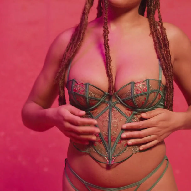 Custom embroidered tulle and satin bodice with satin channel details, intricate elastic strapping, embroidered edge, and satin tie at lower back.