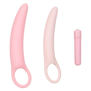 This kit contains two sized toys for gradual dilation and includes a bullet with gentle vibrations for soothing, and more pleasurable vaginal stretching. The bullet can be interchanged between the two dilators.