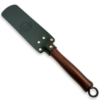 Heavy-Duty. Stylish. Unstoppable. This paddle is designed with a durable double-layered belt leather striking surface for a powerful sound, an ergonomic beech wood handle for ultimate control, and a tough steel hanging loop for easy storage. Power meets panache in this must-have tool.