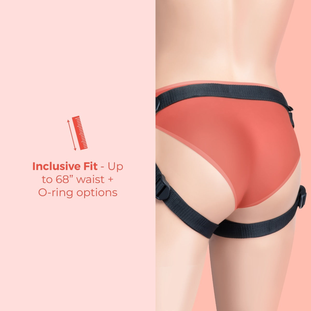 - Inclusive Fit: The integrated O-ring system makes switching sizes easy—it includes three interchangeable silicone O-rings to accommodate various dildo sizes. Meanwhile, the adjustable harness fits waists up to 68”, making it comfortable for most body types, shapes, and sizes.