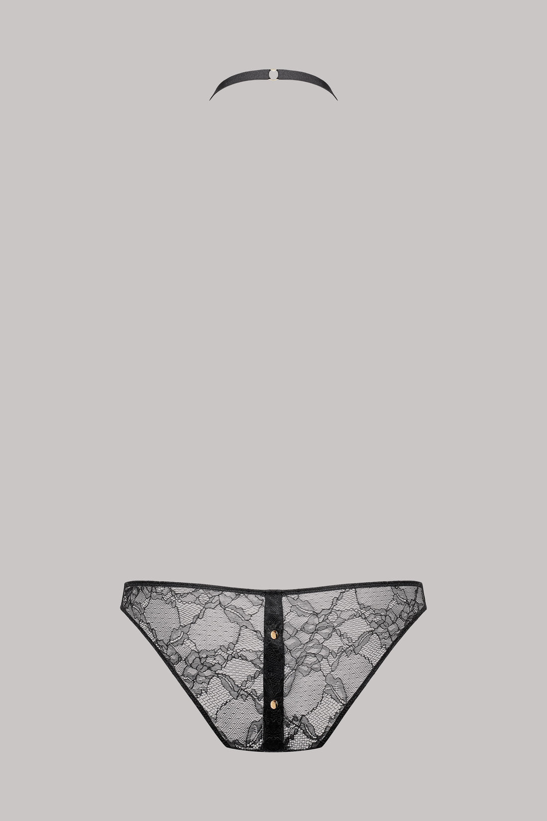 Crafted from delicate floral lace, this low-rise design opens from front to back with discreet golden magnetic press-studs, allowing for effortless access and a teasing sense of control. The adjustable harness sculpts the body while creating the illusion of intricate lacing, balancing elegance with unmistakable intent.